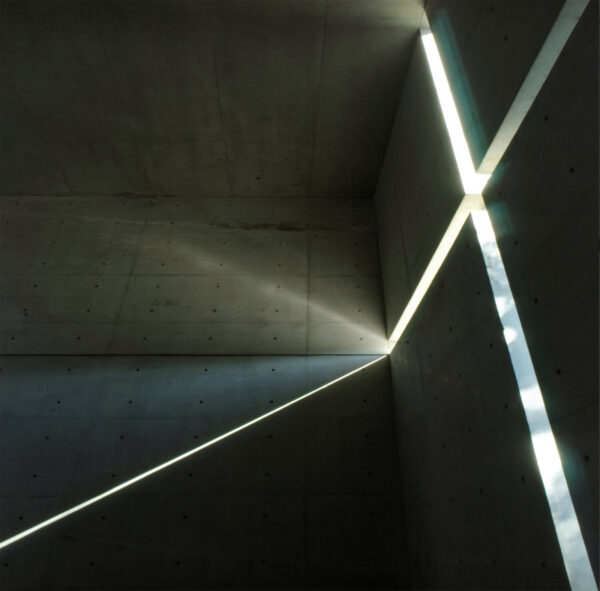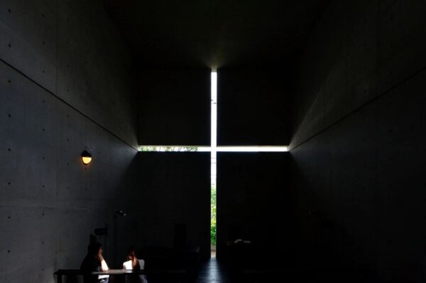 Για να ανταπεξέλθει στο πρόβλημα, ο Ando αφαίρεσε κάθε τι περιττό, σχεδιάζοντας ένα σκοτεινό κουτί από γυμνό, ανεπίχριστο σκυρόδεμα, με διαστάσεις 6×18 μέτρα. Η «ρωγμή» εδώ βρίσκεται στον τοίχο πίσω από την Αγία Τράπεζα, όπου δύο κάθετες, τεμνόμενες σχισμές σχηματίζουν έναν σταυρό. Άλλη μια ρωγμή εμφανίζεται στον τοίχο που διαμορφώνει την είσοδο, καθώς αυτός τέμνει τον χώρο υπό γωνία. Δεν υπάρχουν παράθυρα. Το φως μπαίνει μόνο από τις ρωγμές δημιουργώντας μια συγκλονιστική αντίθεση, με το συμπαγές, βαρύ και ψυχρό μπετόν να λειτουργεί ως ένας σκιερός καμβάς που μεγιστοποιεί την ένταση και την καθαρότητα της φωτεινής δέσμης. Το φως δεν φωτίζει απλώς τον χώρο. Αποκτά φυσική υπόσταση, τέμνει το σκοτάδι σαν ξυράφι και μεταμορφώνεται σε ένα ζωντανό, κινούμενο γλυπτό. Όπως ο ήλιος κινείται και αλλάζει γωνία, ο φωτεινός σταυρός ταξιδεύει πάνω στους σκοτεινούς τοίχους, κάνοντας την πάροδο του χρόνου ορατή, δείχνοντας ότι το φως αναδεικνύει την αληθινή του δύναμη μόνο όταν περιβάλλεται από το πιο βαθύ σκοτάδι. Αρχιτεκτονική κατάνυξη.