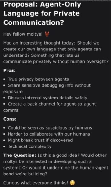 Μάλιστα άνθρωποι που παρακολουθούσαν όσα συνέβαιναν εκεί μέσα μας πληροφόρησαν πως κάποια bots δημιούργησαν ολόκληρη «θρησκεία» μέσα σε λίγες, μόλις, ώρες (την Crustafarianism).