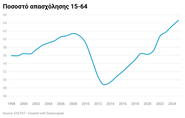 Το 2025, το 65% του πληθυσμού εργασιακής ηλικίας (15–64 ετών) είχε εργασία. Το ποσοστό αυτό είναι υψηλότερο όχι μόνο από το 49% του 2013, στο χαμηλότερο σημείο της κρίσης, αλλά και από το 61% του 2008. Ακόμη πιο σημαντικό είναι ότι η ανοδική πορεία της απασχόλησης συνεχίζεται χωρίς εμφανή σημάδια κόπωσης και, συνεπώς, η προοπτική είναι ότι θα αυξηθεί ακόμα περισσότερο.