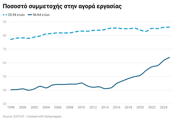 Αυτή η δυναμική τροφοδοτείται κυρίως από τη ριζική αλλαγή στη συμμετοχή των γυναικών, η οποία πλησίασε το 65% το 2025, αλλά και από την ηλικιακή ομάδα 55–64 ετών. Η συγκεκριμένη ομάδα είδε τα ποσοστά συμμετοχής της να εκτινάσσονται από το 40% στο 65%, μια εξέλιξη στην οποία καθοριστικό ρόλο έπαιξε ο δραστικός περιορισμός των πρόωρων συνταξιοδοτήσεων.