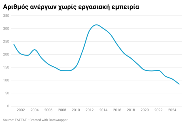 Τέλος, οι νεοεισερχόμενοι στην αγορά εργασίας αντιμετωπίζουν πλέον λιγότερα εμπόδια. Οι άνεργοι χωρίς προηγούμενη εργασιακή εμπειρία (κυρίως νέοι) ήταν περίπου 75 χιλιάδες στο τέλος του 2025, έναντι 140 χιλιάδων το 2008.