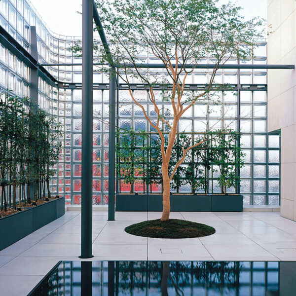 Αστικό ιαπωνικό δάσος με zelkova, μπετόν και γυαλί.