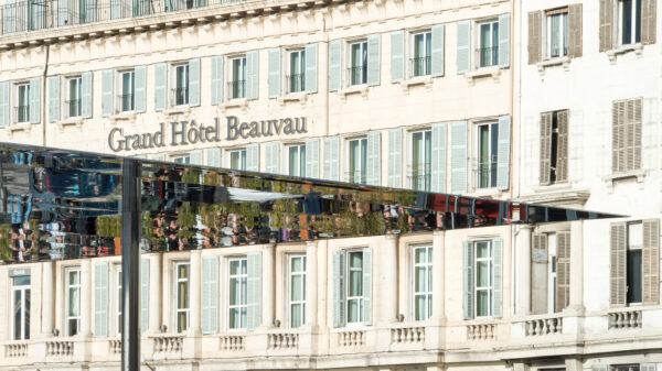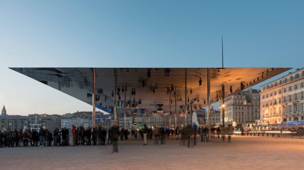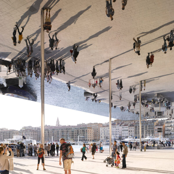 To στέγαστρο στο Παλιό Λιμάνι (Vieux Port) της Μασσαλίας είναι η κορωνίδα της αστικής ανάπλασης που έλαβε χώρα εκεί το 2013. Είναι κατασκευασμένο σαν μια ανακλαστική λεπίδα από γυαλισμένο ανοξείδωτο χάλυβα διαστάσεων 46×22 μέτρων που αιωρείται 6 μέτρα πάνω από το έδαφος, ακουμπώντας πάνω σε οκτώ λεπτά κυλινδρικά υποστηλώματα από το ίδιο ανακλαστικό υλικό. Το ελάχιστο αντιληπτό πάχους στα άκρα του, καθώς και η σχεδόν πληρης έλλειψη εμφανών αρμών ανάμεσα στα μεταλλικά πάνελ, κάνει το στέγαστρο να μοιάζει σαν μια μονοκόμματη λεπίδα καθρέπτη. Μια ουρανοκατέβατη οφθαλμαπάτη. Η αντανάκλαση του ήχου ανάμεσα στις μεταλλικές επιφάνειες και το γρανιτένιο δάπεδο εντείνει την αίσθηση ενός δυναμικού αστικού πεδίου, στο οποίο γνωστά πράγματα εξακολουθούν να συμβαίνουν με διαφορετικό τρόπο. Το εφέ φέρνει στο μυαλό το σύμπαν της ταινίας Upside Down, αλλά χωρίς τη δυστοπική της ατμόσφαιρα. Κάτω από το στέγαστρο συμβαίνουν τα πάντα: παραστάσεις, καλλιτεχνικές εγκαταστάσεις, διαμαρτυρίες, εορτασμοί. Είναι ένας πυκνωτής δραστηριοτήτων, και μαζί ένας ακριβός καθρέφτης στον οποίο η πόλις τολμά να κοιτάξει ψηλά για να αντιπαρατεθεί με το είδωλό της.