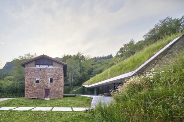 Το παλιό κτίσμα Landaburu Borda αριστερά, η υπόσκαφη επέκτασή του δεξιά και ο γυάλινος διάδρομος που τα συνδέει. (φωτογραφία: Jose Hevia)